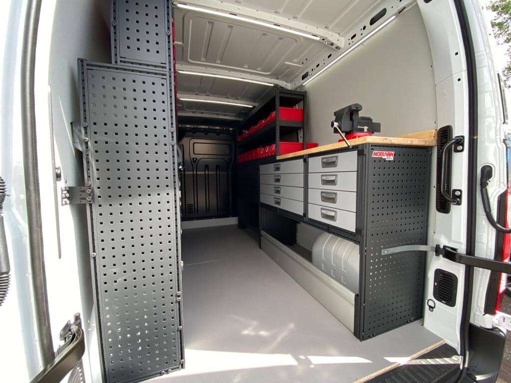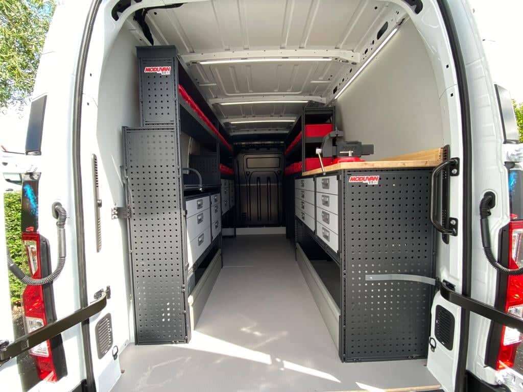 Een prachtige inrichting van Modul-System is hier volledig op zijn plaats. Een combinatie van lades, legborden, sorteerbakken en een werkbank maken het compleet. Een minimaal eigen gewicht maakt de laadcapaciteit tot zijn maximum!