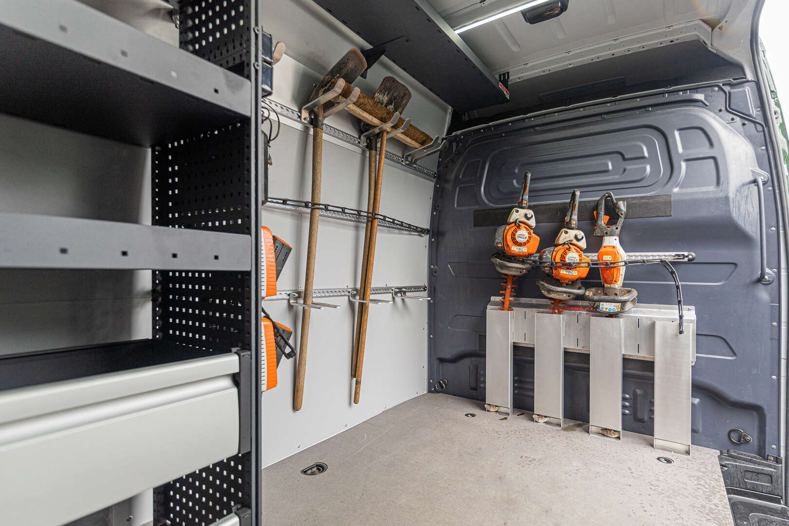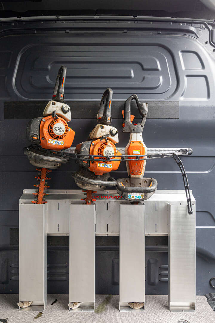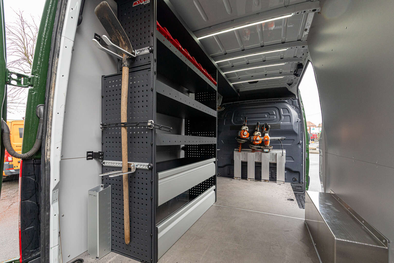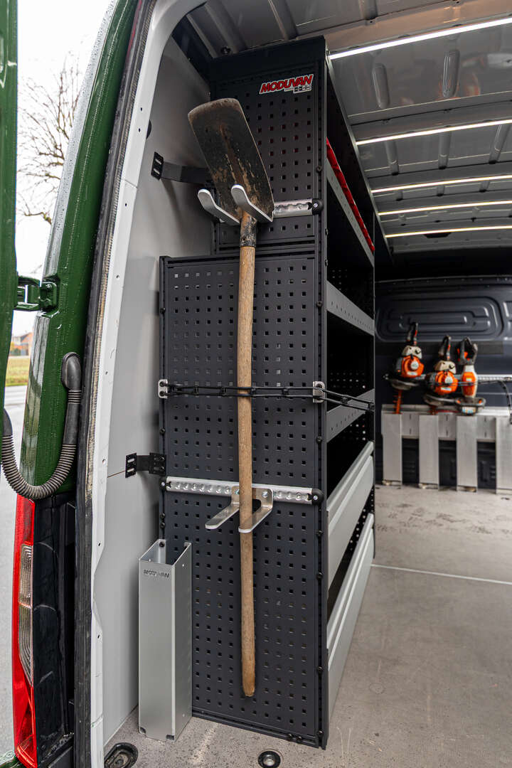 Voor tuinarchitect en -aanleg Phlypo uit Roeselare mocht Moduvan deze Mercedes Sprinters ombouwen tot betrouwbare werkkrachten. Beide voertuigen hebben een identieke Modul-System inrichting, voorzien van talloze opbergopties voor materiaal. Tegen het tussenschot werd een houder voorzien voor een viertal haagscharen.