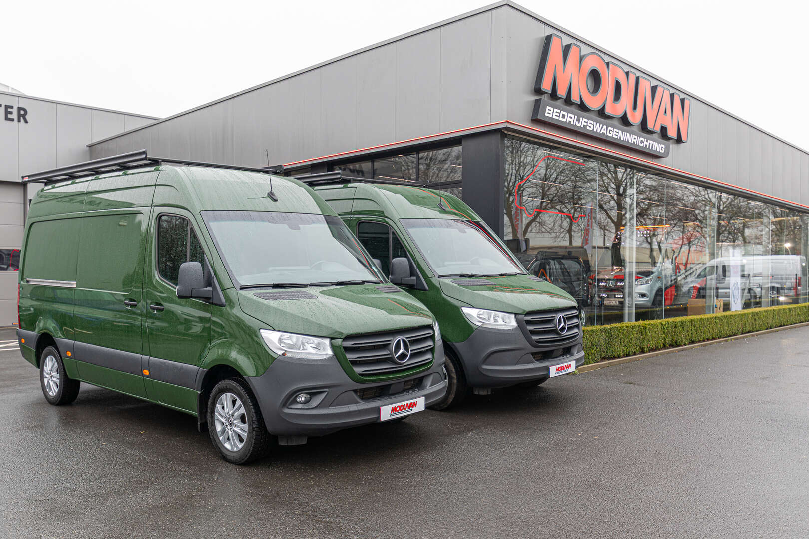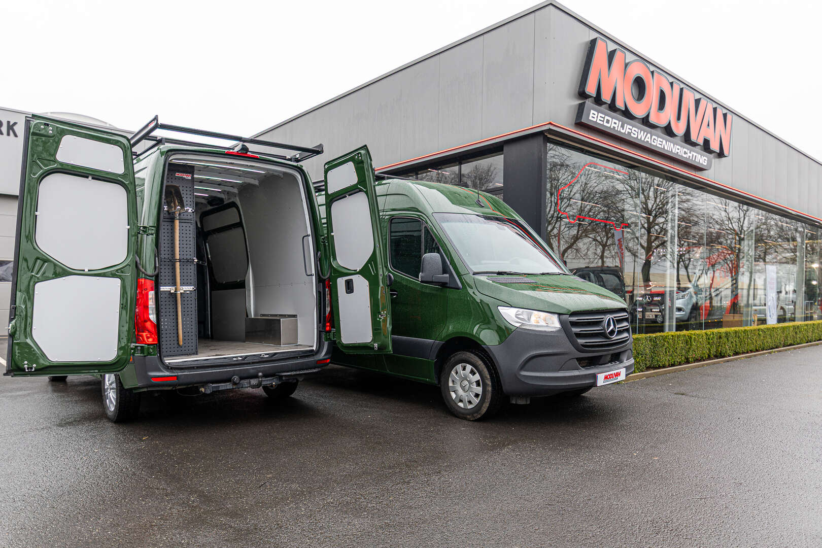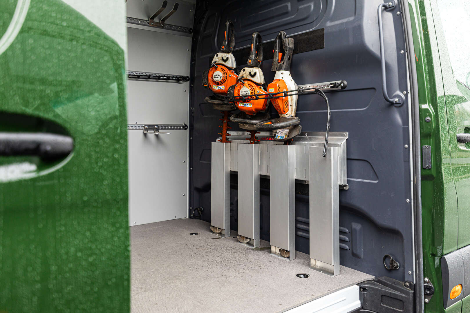 Voor tuinarchitect en -aanleg Phlypo uit Roeselare mocht Moduvan deze Mercedes Sprinters ombouwen tot betrouwbare werkkrachten. Beide voertuigen hebben een identieke Modul-System inrichting, voorzien van talloze opbergopties voor materiaal. Tegen het tussenschot werd een houder voorzien voor een viertal haagscharen.