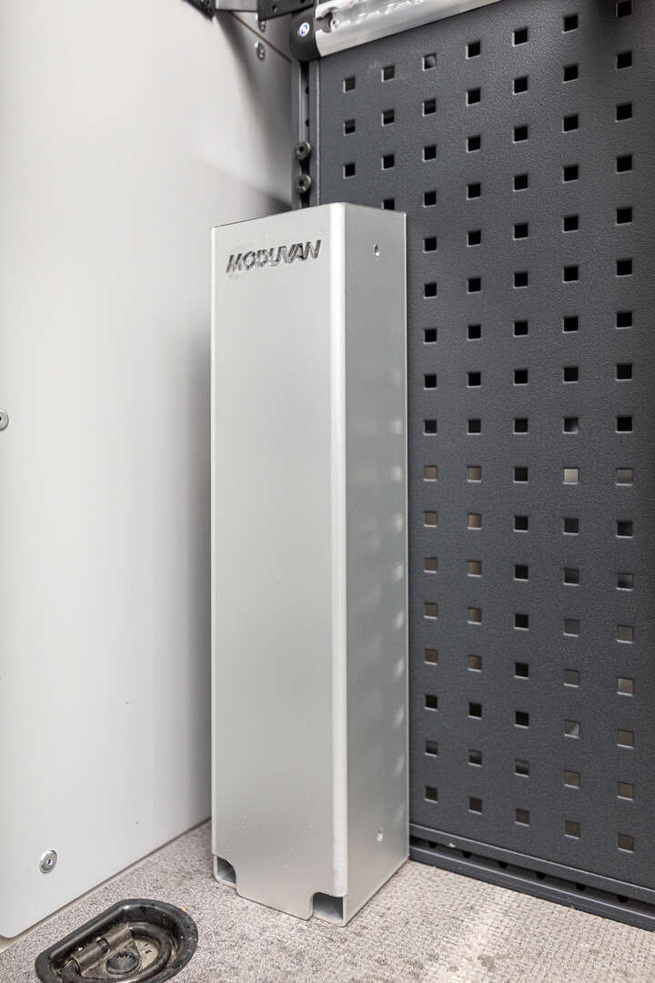Aan de zijwand van beide bestelwagens werden multifunctionele haken gemonteerd, waar borstels en schoppen aan bevestigd kunnen worden.